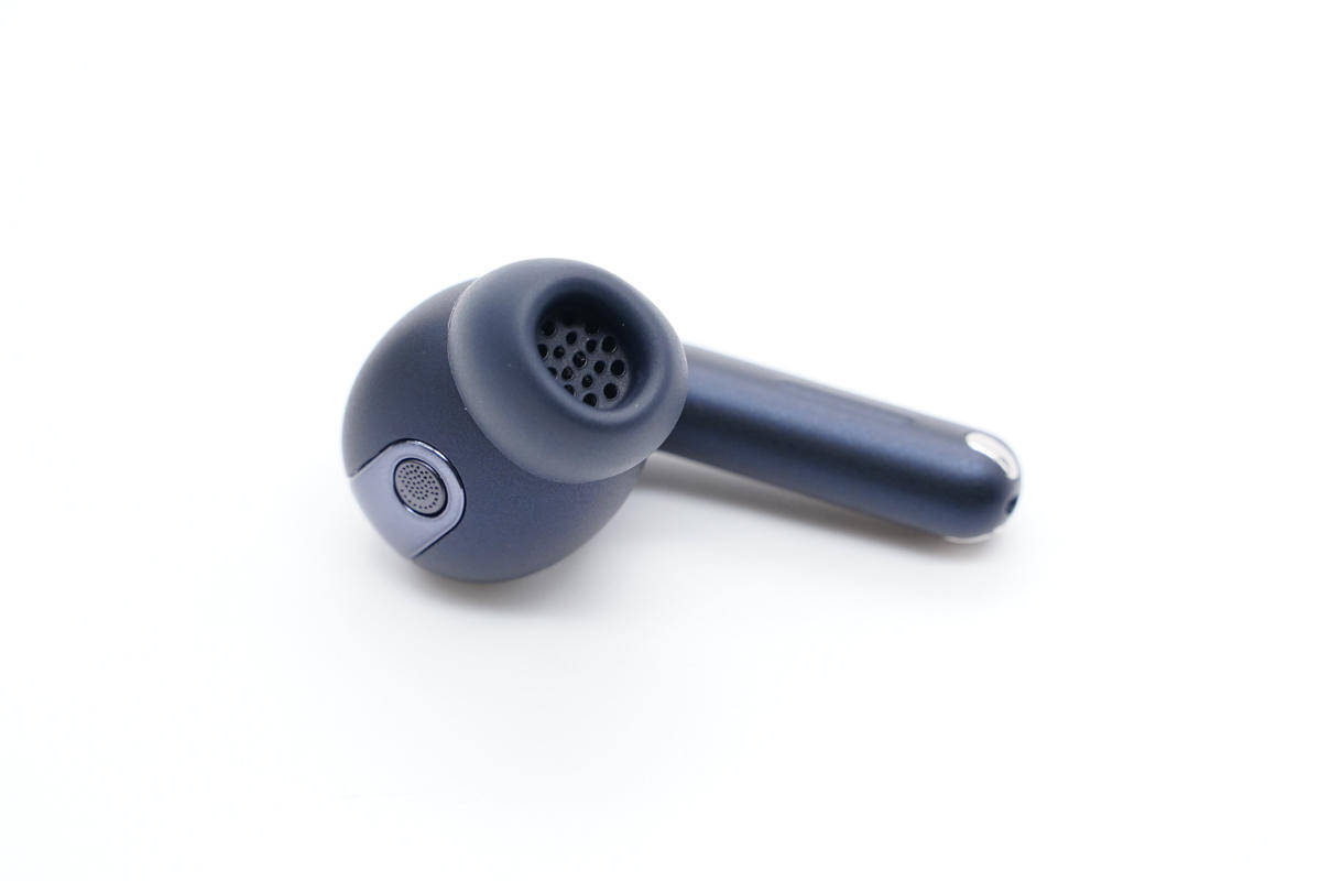 耳機(jī)柄頂部有一顆圓形降噪麥克風(fēng)開孔。